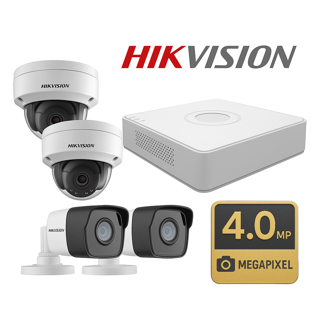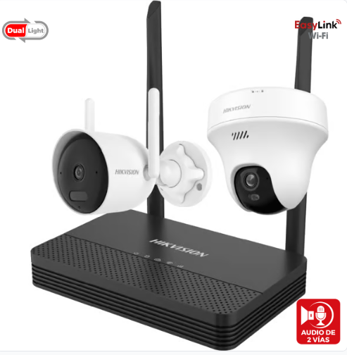 KIT IP INALÁMBRICO 4 MEGAPIXEL / NVS 4 CANALES / 1 CÁMARA BALA EXTERIOR + 1 CÁMARA TURRET INTERIOR CON LENTE 2.8 MM Y DUAL LIGHT / AUDIO BIDIRECCIONAL (MICRÓFONO Y BOCINA) / SOPORTA MICRO SD DE 512 GB